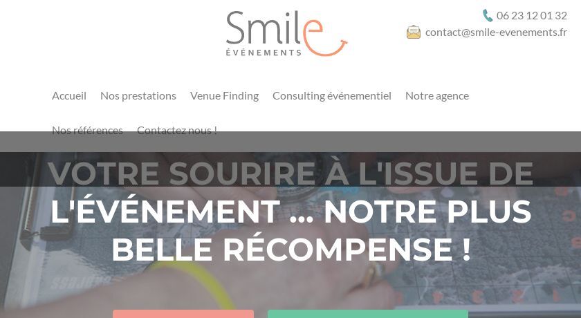 Spécialiste de l'organisation d'événements pour les entreprises, Smile Evenement vous accompagne dans la réalisation de vos projets d'événements en France et à l'étranger : séminaires, team building, incentive, voyages d'affaires, soirées d'entreprises... N'hésitez pas à contacter cette agence pour en savoir plus sur son expertise et discuter de vos besoins.