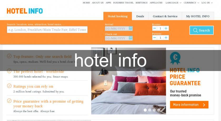 hotel.info est un service de réservation en ligne avec plus de 200.000 hôtels dans le monde entier. Les clients effectuant des réservations via notre site profitent entre autres des tarifs préférentiels et d´un large choix d´hôtels à votre goûts