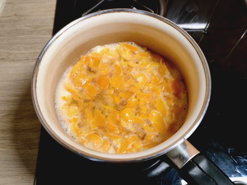 Avant de cuire la confiture de kumquat proprement dite, il faut précuire les morceaux d'agrumes dans leur eau de macération.