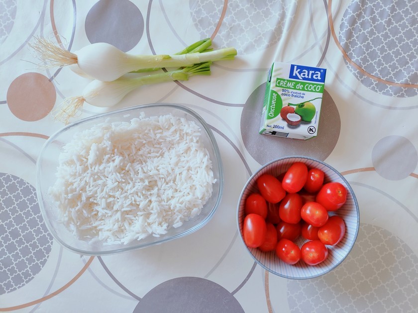 Voici les ingrédients nécessaires pour préparer une salade de riz aux tomates cerises et au lait de coco pour 4 personnes :