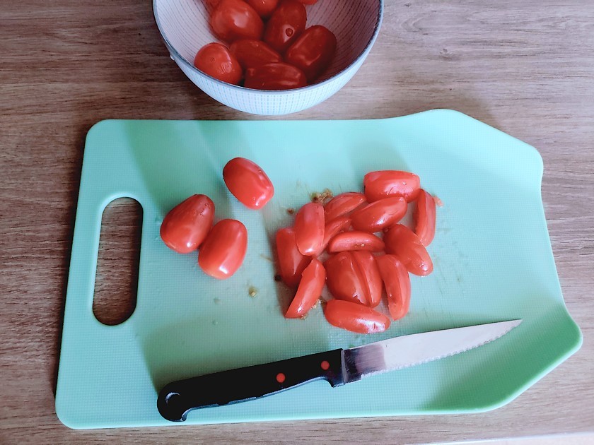 1- Lavez les tomates cerises puis coupez-les en deux ou en quatre en fonction de leur taille.