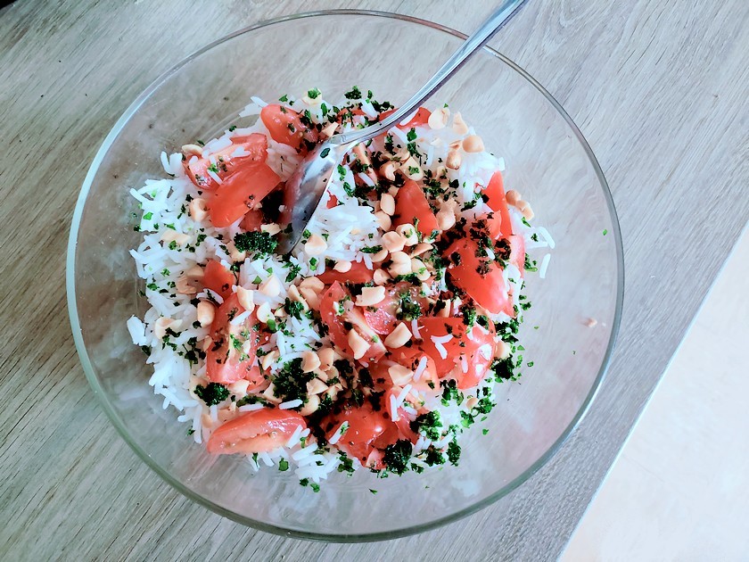Tag : salade de riz, salade de riz au lait de coco, salade de riz au coco, salade de riz recette, salade de riz facile, salade de riz tomates cerises, salade de riz coco cacahuète, salade de riz tomate et herbes, salade de riz , Riz, lait de coco, tomates cerises, salade, cébettes, oignons frits, Huile d'olive, cacahuètes, brique, cuit, texture, cuillères, Soupe, citron vert, exotique, ingrédient, découpe, Taille, couteau, riz basmati, Basmati, montage, Froid, saladier, Grains, Zeste, poêle, frire, salades, saveur, bouquet, coriandre, persil, ciboulette, sel, poivre, crème de coco, sucrée, homogène, jus,