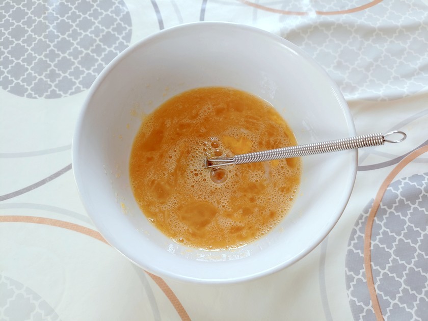 1- Dans un autre récipient, fouettez les œufs entiers avec le sucre jusqu’à ce que le mélange mousse.
