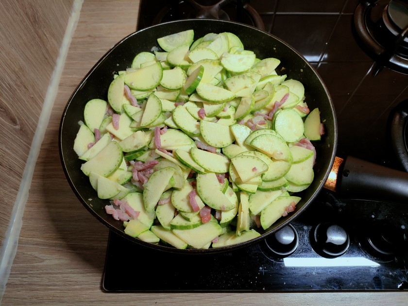 4- Ajoutez les rondelles de courgettes et faites-les revenir avec l'oignon et les lardons pendant une dizaine de minutes.