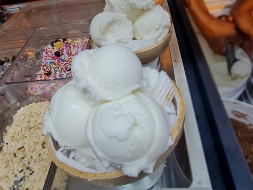 Pour composer un dessert de Noël frais et original, vous pouvez associer des copeaux de noix de coco fraîche avec une boule de glace à la noix de coco et une boule de sorbet de votre choix (mangue, passion ou citron vert par exemple).