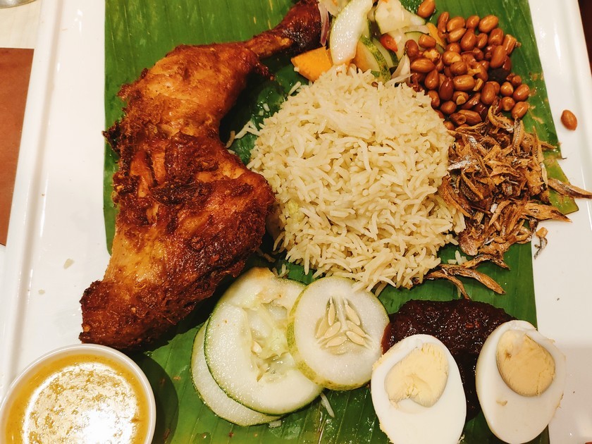 Ce plat national, composé de riz cuit dans du lait de coco accompagné d'œufs durs, de poulet, de concombre, de cacahuètes, d'anchois séchés et de sauce sambal est plutôt copieux.
