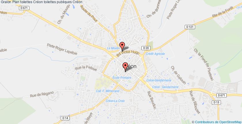 Plan (cliquez sur le plan pour le rendre interactif) Voir les toilettes les plus proches Liste des toilettes Créon Adresse toilette Accès PMR Horaires 16 Rue Geynet 33670 Créon 62 Boulevard Victor Hugo 33670 Créon Adresse Accès PMR Horaires