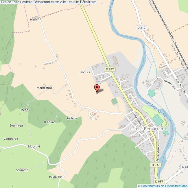 Plan de la ville de Lestelle-Bétharram, cliquer dessus pour obtenir un plan interactif avec niveaux de zoom. La Ville de Lestelle-Bétharram dans le département Pyrénées-Atlantiques a une population de 850 habitants, une superficie de 9 Km2, soit une densité de population pour la carte de Lestelle-Bétharram de 94 Habitants/Km2 et une altitude de 984 m.