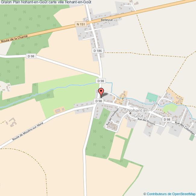Plan de la ville de Nohant-en-Goût, cliquer dessus pour obtenir un plan interactif avec niveaux de zoom. La Ville de Nohant-en-Goût dans le département Cher a une population de 593 habitants, une superficie de 25 Km2, soit une densité de population pour la carte de Nohant-en-Goût de 24 Habitants/Km2 et une altitude de 501 m.
